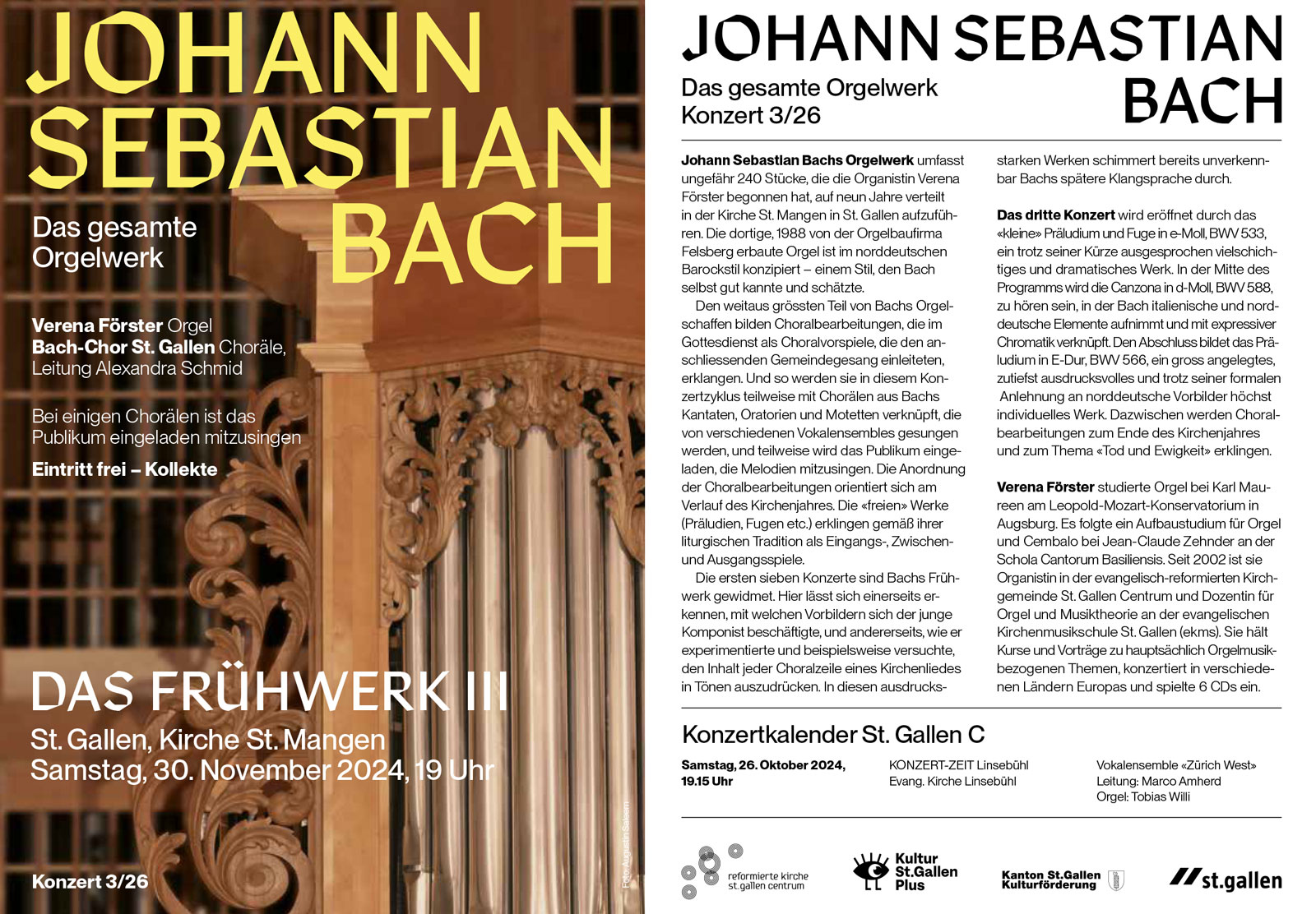 Im Rahmen ihrer im März 2024 in der Kirche St. Mangen in St. Gallen begonnenen Gesamtaufführung des Orgelwerks von Johann Sebastian Bach beschäftigt sich Verena Förster momentan mit dessen Frühwerk. Und so ist es naheliegend, dass sie eine Auswahl daraus auch auf ihre Konzertreise nach Sachsen mitnimmt.